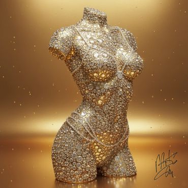 "Phantom Elegance in Molten Light" captures the haunting beauty of a gold female torso suspended in a surreal, gilded void. Radiating both power and vulnerability, the figure emerges like a forgotten goddess—drenched in molten metal, shimmering between reality and desire.