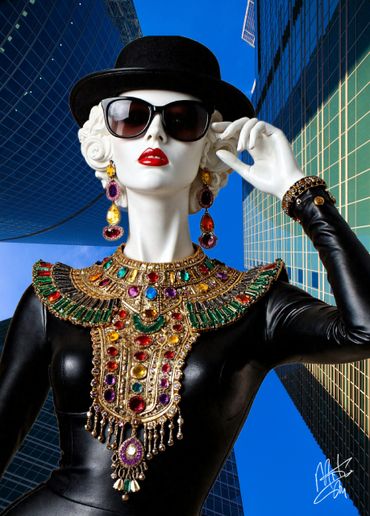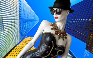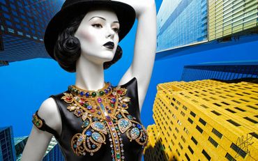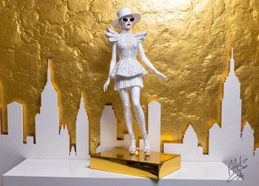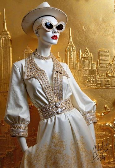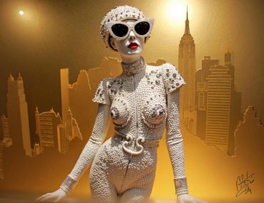 Each piece is a statement: bold, provocative, and impossibly luxe. These works shimmer with electric color and cinematic intensity—infused with the energy of Manhattan nights, the allure of celebrity culture, and the audacious spirit of high fashion.