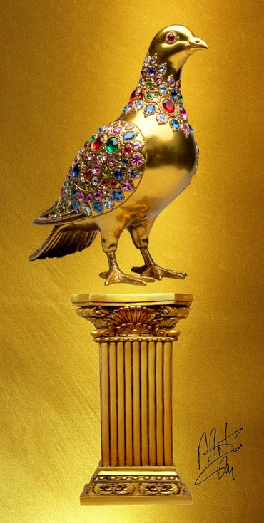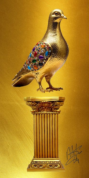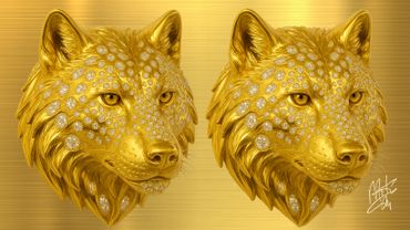 "Swag Dogs in Gold" is Marko Stout’s unapologetic fusion of high fashion and canine cool — a surreal celebration of status, style, and obsession. Each piece features sculpted dogs cast in radiant gold, dripping in jewels and attitude, posed against molten metallic backdrops that reflect the excess of modern glamour. Fierce, flamboyant, and undeniably luxe, this collection blurs