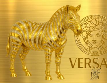 "Elegance in Stripes of Delirium" captures a surreal tension between refinement and chaos—a golden zebra caught between instinct and indulgence. Marko Stout reimagines nature’s design through the lens of excess, turning wildness into a shimmering statement on identity, illusion, and the seductive pull of the extraordinary.