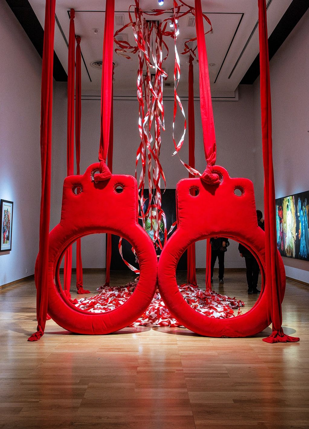 “Cuffed in Velvet” is a towering spiral of oversized red velvet handcuffs and satin ribbons, sensually twisting upward like a seductive helix of control and desire. Set against the stark minimalism of a modern gallery, the installation blurs the line between restraint and elegance, inviting viewers to question what binds them—softly.