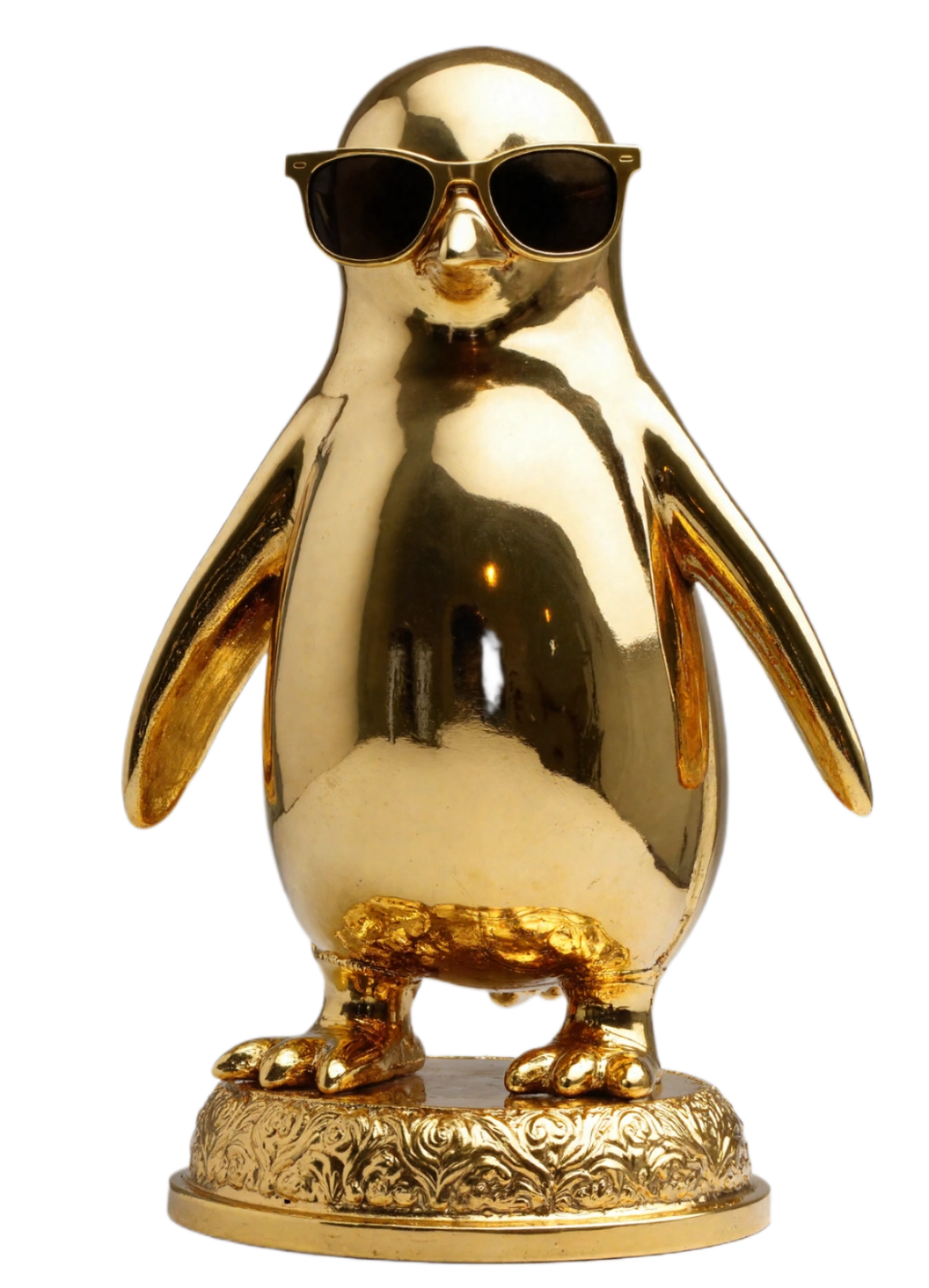 "Arctic Majesty in Shades" is a 4 foot tall surreal fusion of opulence and irony—an icon of cool detachment, cloaked in radiant gold and crowned with reflective sunglasses. This sculpture captures the paradox of power and playfulness, transforming a humble creature of ice into a symbol of untouchable glamour and frozen authority.
