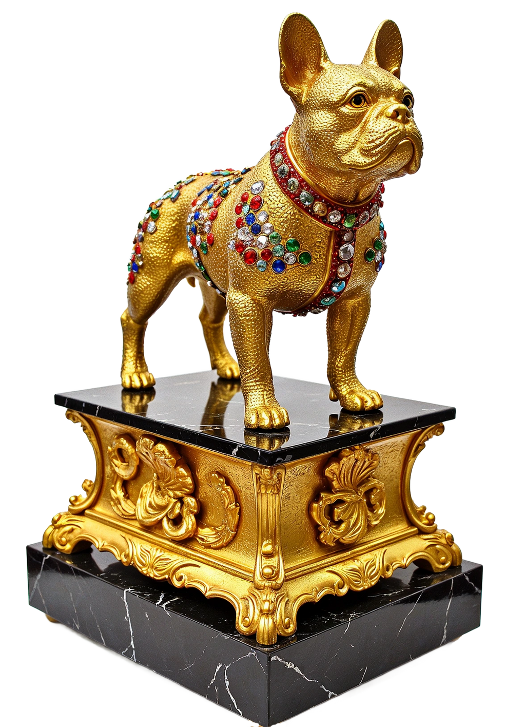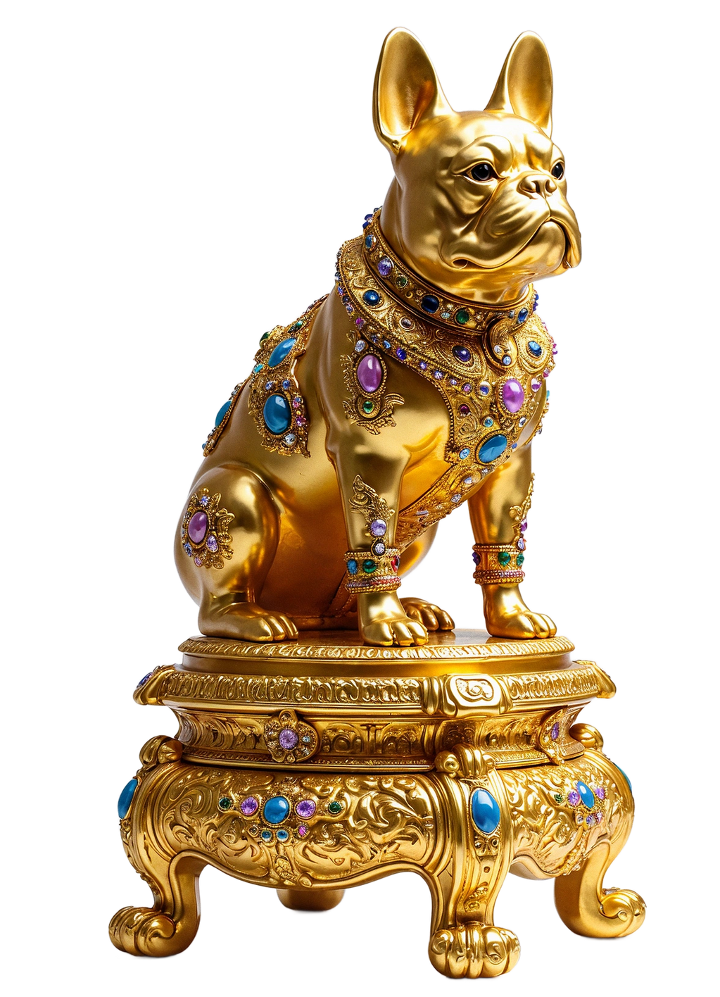 "Ornament of the Obscene Divine" is a 4-foot opulent French Bulldog sculpture by Marko Stout, shimmering in gold with unapologetic excess and surreal elegance. A decadent fusion of couture and creature, the piece radiates high-gloss glamour and divine arrogance—an untouchable icon of luxury born to dominate both pedestal and gaze.