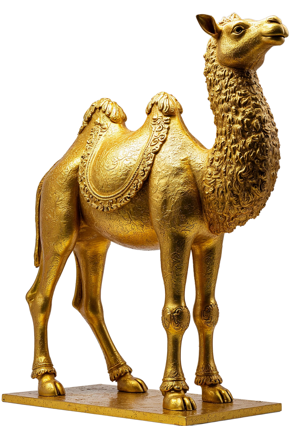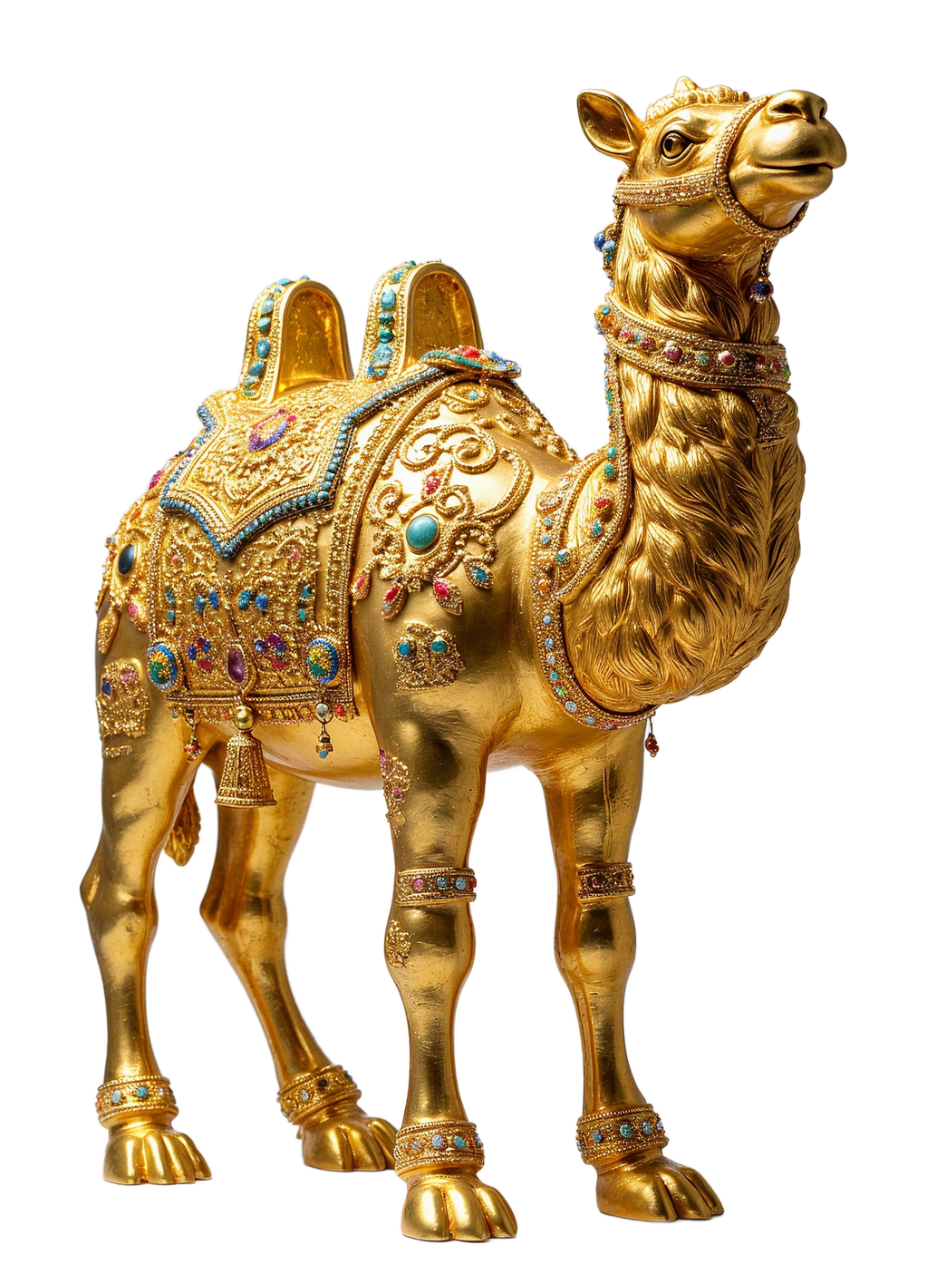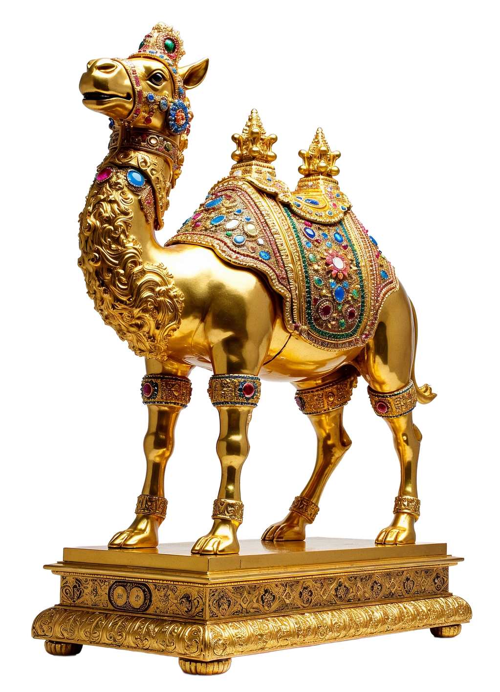 "Crowned in Silence" and Sun is a surreal 4-foot sculpture by Marko Stout, presenting a gold-drenched camel poised on a lavish pedestal—regal, motionless, and mythic. Bathed in a silent blaze of imagined suns, the piece evokes ancient royalty and divine stillness, where luxury becomes a language of power whispered through desert light.