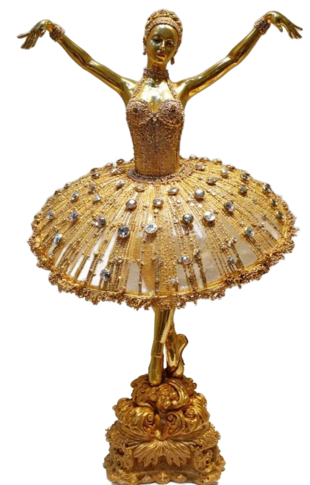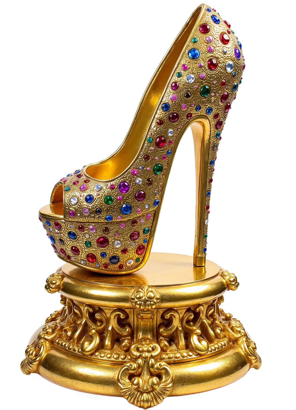 "Whispers Bent in Gold" is a surreal, jewel-encrusted stiletto sculpture by Marko Stout—an opulent form frozen mid-stride, where elegance becomes myth. Radiating with gold and enigma, the piece captures the ghost of a movement never made, a whisper of power, seduction, and luxury distorted into something untouchably divine.