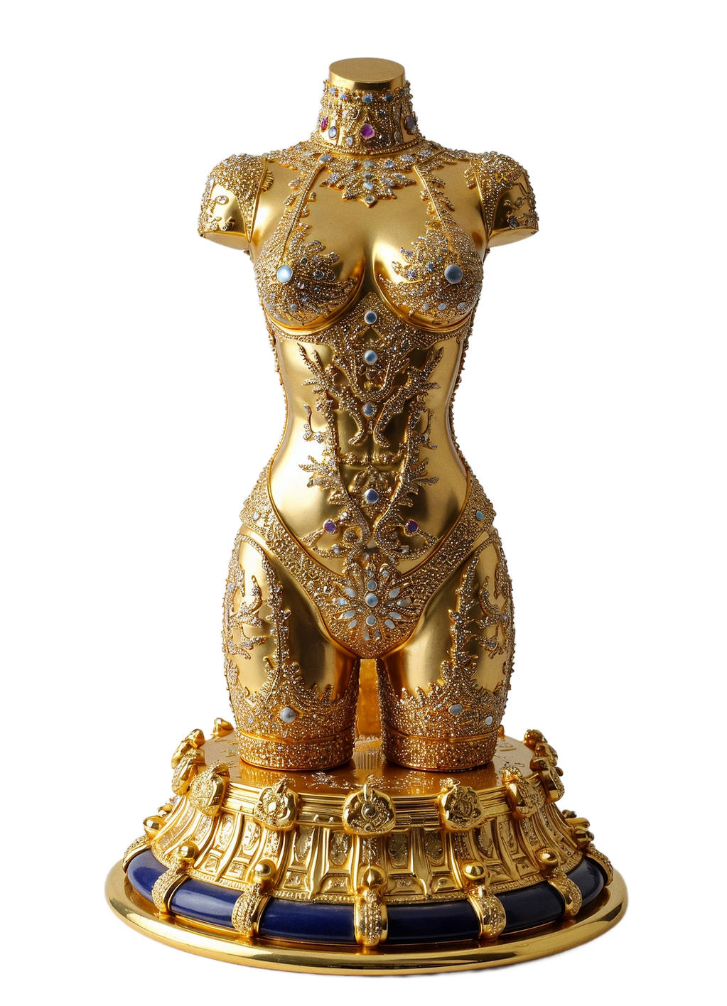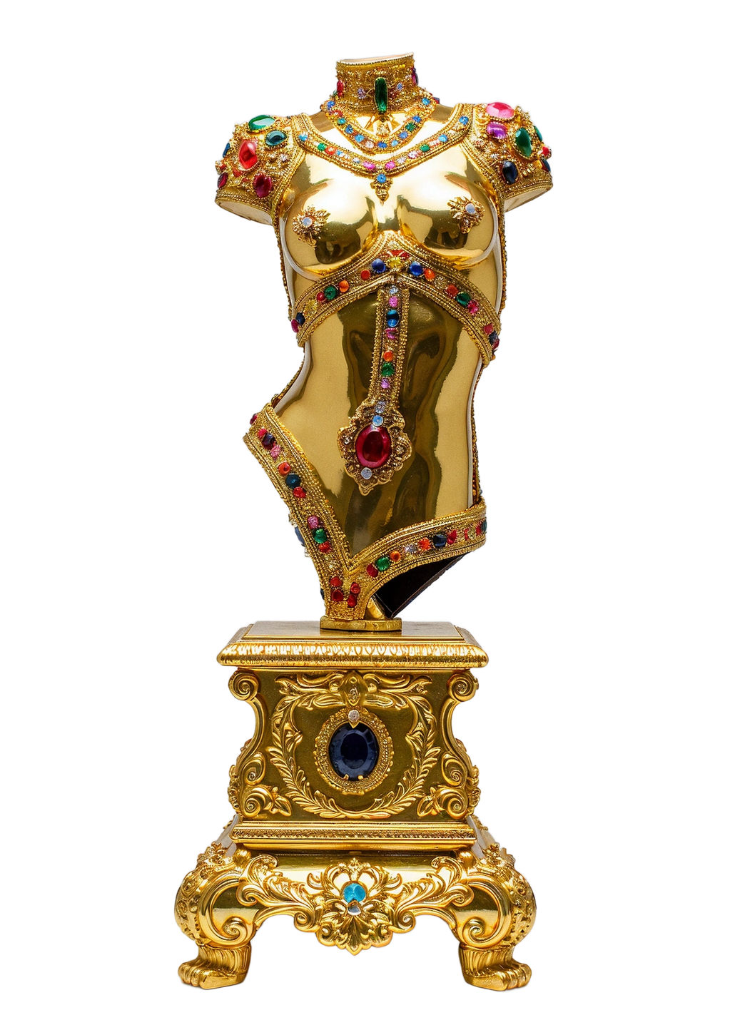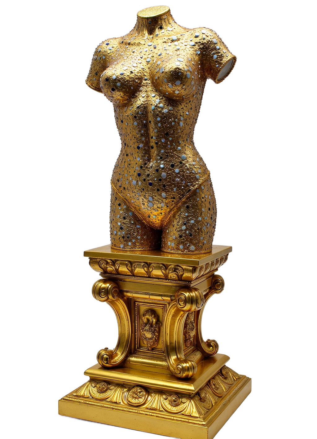 "Ornament of a Forgotten Flame" is a surreal and luxurious sculpture by Marko Stout, presenting a gem-encrusted, gold-plated female torso that glows with the memory of desire long extinguished. Suspended between divinity and decay, the piece evokes a lost moment of passion—preserved in brilliance, adorned in silence, and burning forever beneath the surface of its opu
